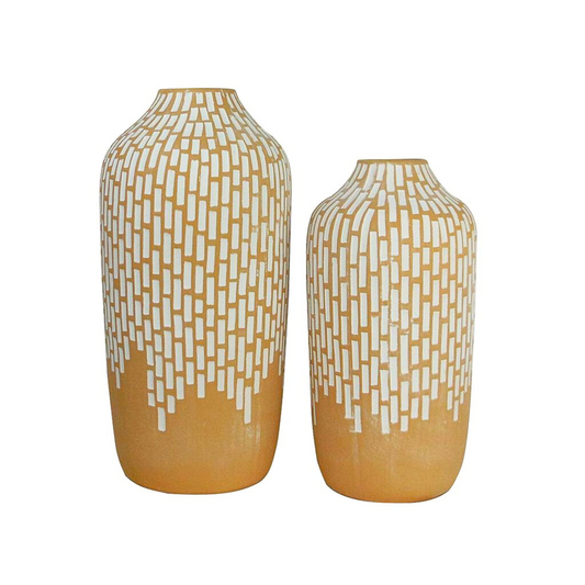 Set of 2 Oblong Ceramic Vases - Sand Or Gray With White Mosaic Design