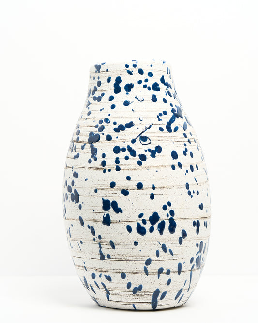Squat Tear Drop Ceramic Vase - White With Marine Blue Splatter | Splat Collection by Aria Home